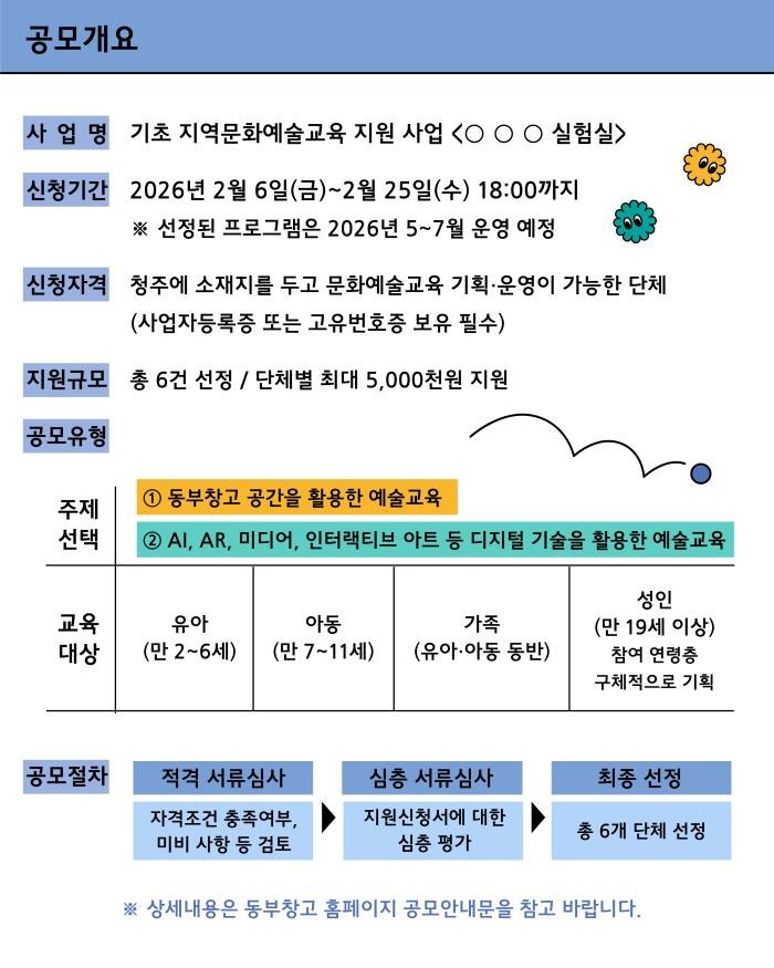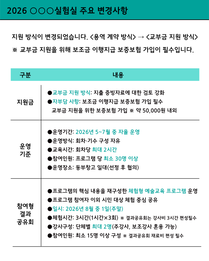 | 제목 | 2026 기초 지역문화예술교육 지원 사업 [000실험실] 프로그램 운영 단체 공모 |