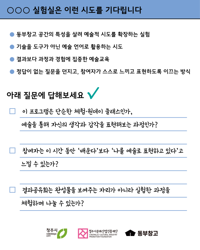 참고자료 - 2025 [○○○ 실험실] 프로그램: https://dbchangko.org/sub.php?code=84&mode=view&program_type=3&no=23 - 2025 예술교육 성과영상: https://www.youtube.com/watch?v=KK8bS4-prKI - 2025 예술교육 아카이빙: https://dbchangko.org/sub.php?code=73&mode=view&no=56&category=&page=1&search=&keyword= ![]() ![]() ![]() ![]() ![]() |