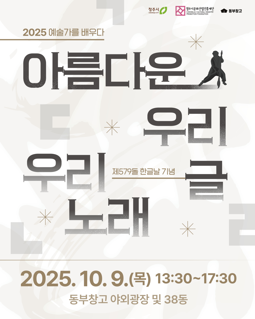 2025 <예술가를 배우다> - 아름다운 우리 글, 우리 노래 - 579번째 한글날을 맞이하여, 세종대왕의 뜻을 기리고 우리 글과 말의 아름다움을 함께 나누고자 합니다. 한글에 담긴 이야기를 예술로 만나고, 함께 즐겁게 나눌 수 있는 자리를 마련하였습니다.  ○ 일시: 2025. 10. 9.(목) 13:30~17:30 ○ 장소: 동부창고 야외광장 및 38동
