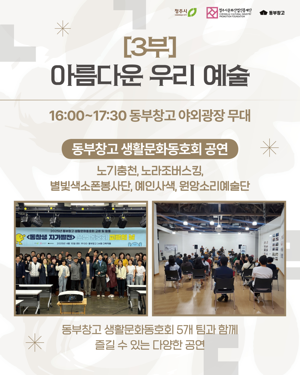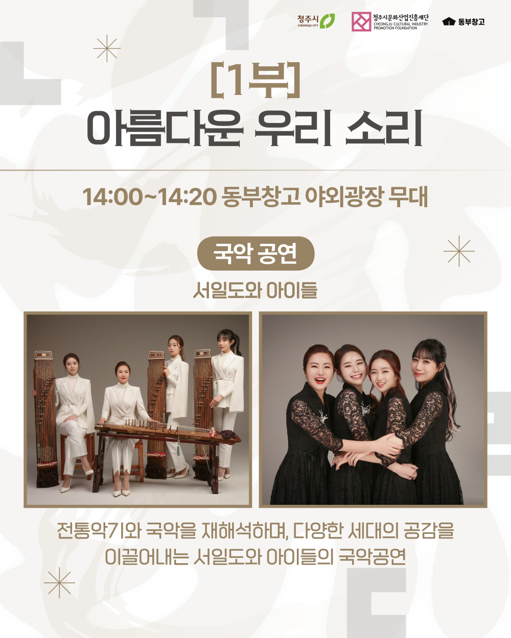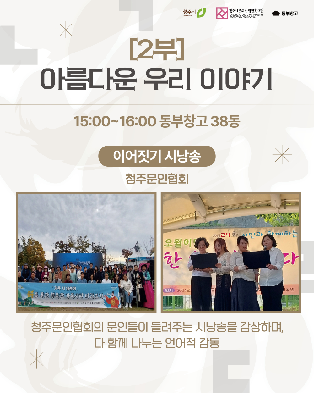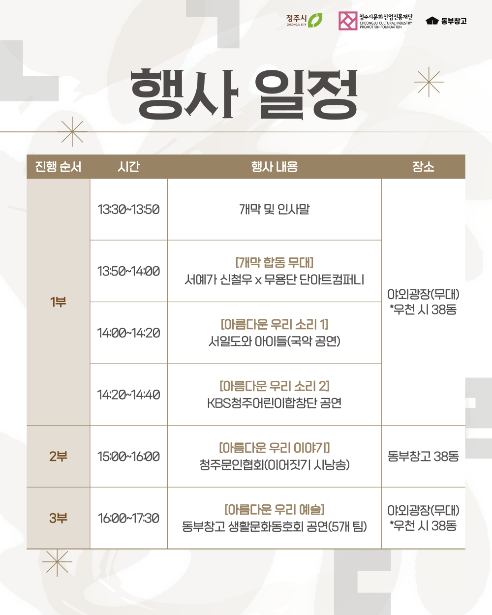 [1부] 아름다운 우리 소리 서예가 신철우 X 무용단 단아트컴퍼니 서일도와 아이들(국악 공연) KBS청주어린이합창단 공연 [2부] 아름다운 우리 이야기 청주문인협회(이어짓기 시낭송) [3부] 아름다운 우리 예술 동부창고 생활문화동호회 공연 (5개 팀) ☆뜻깊은 날, 귀한 걸음으로 함께해 주시어 한글의 소중한 가치를 나누고 빛내 주시기를 바랍니다★ ![]() ![]() ![]() ![]() ![]() ![]() ![]() ![]() ![]()
