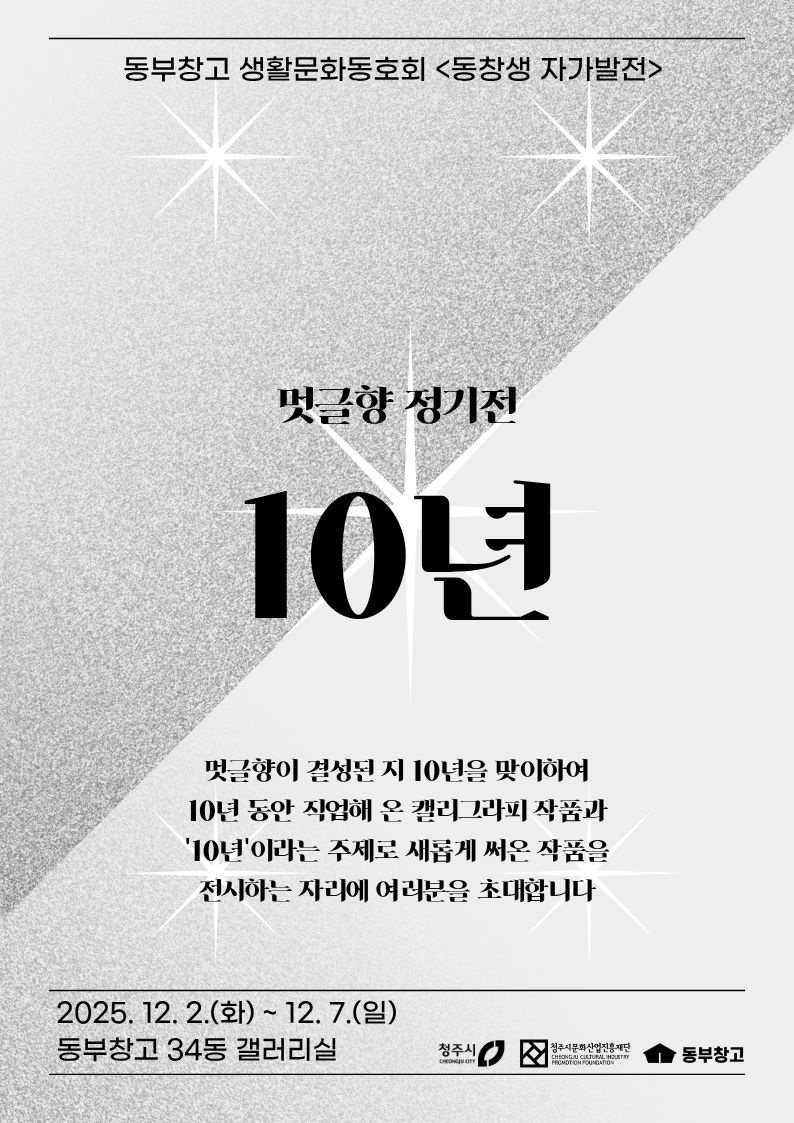 <멋글향>은 2014~2015년 청주시문화산업진흥재단에서 진행한 프로그램 중 캘리그라피 강좌의 수강생들이 지속적 활동과 실력 향상을 도모하고자 결성된 동호회입니다. 정기모임을 통한 실력 향상과 회원 간 친목을 도모하고, 연 1회 정기전시를 개최하여 결과도 홍보하고 캘리그라피 써주기 행사 등을 통해 재능기부도 하고 있습니다. <멋글향>이 결성된 지 10년을 맞이하여 ‘10년’이라는 주제로 캘라그라피 작품을 제작하였습니다. 강산도 변한다는 10년 동안 작업해 온 캘라그라피 작품과, ‘10년’이라는 주제로 새롭게 써온 작품을 전시하고자 합니다. ![]() |