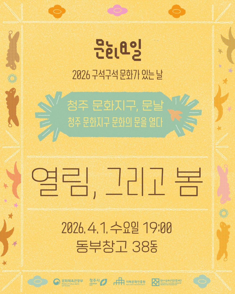청주에서 특별한 하루가 열립니다. <열림, 그리고 봄> 마술로 시작하는 설렘 음악으로 기록하는 일상 공연으로 완성되는 하루를 만들어보세요 ! 2026. 4. 1 (수) 19:00 동부창고 38동 |