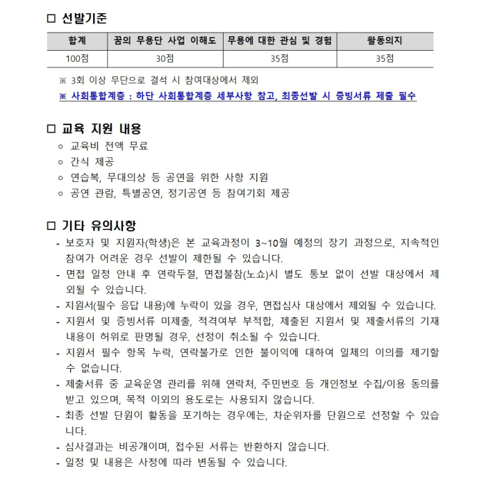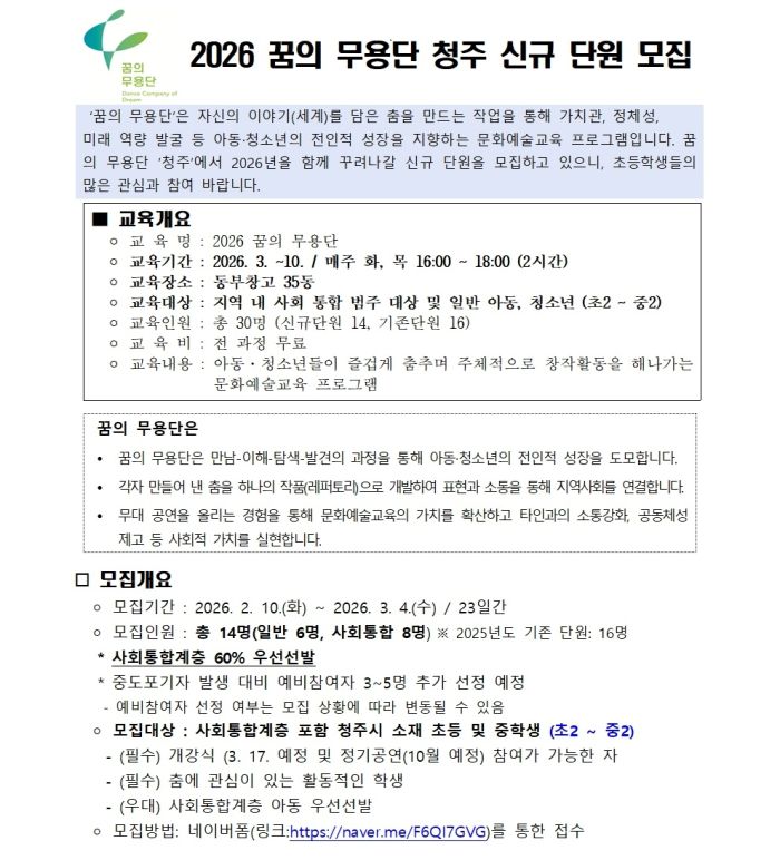 ■ 모집개요 ⚪ 모집기간 : 2026. 2. 10.(화) ~ 2026. 3. 4.(수) / 23일간 ⚪ 모집인원 : 총 14명(일반 6명, 사회통합 8명) ※ 2025년도 기존 단원: 16명 * 사회통합계층 60% 우선선발 * 중도포기자 발생 대비 예비참여자 3~5명 추가 선정 예정 - 예비참여자 선정 여부는 모집 상황에 따라 변동될 수 있음 ⚪ 모집대상 : 사회통합계층 포함 청주시 소재 초등 및 중학생 (초2 ~ 중2) - (필수) 개강식 (3. 17. 예정 및 정기공연(10월 예정) 참여가 가능한 자 - (필수) 춤에 관심이 있는 활동적인 학생 - (우대) 사회통합계층 아동 우선선발 ⚪ 모집방법: 네이버폼(링크:https://naver.me/F6QI7GVG)를 통한 접수
