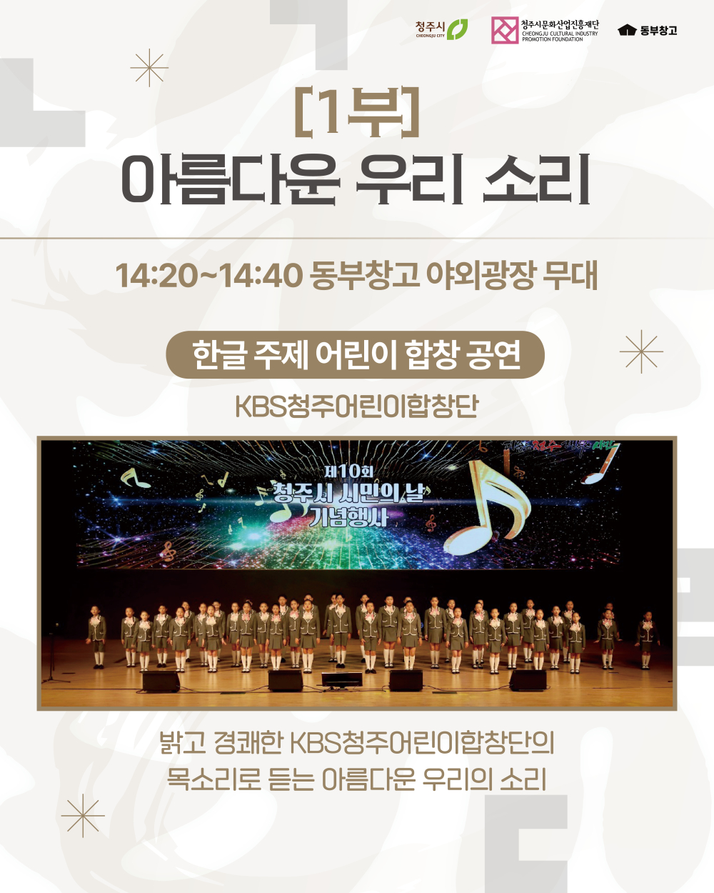 [1부] 아름다운 우리 소리 서예가 신철우 X 무용단 단아트컴퍼니 서일도와 아이들(국악 공연) KBS청주어린이합창단 공연 [2부] 아름다운 우리 이야기 청주문인협회(이어짓기 시낭송) [3부] 아름다운 우리 예술 동부창고 생활문화동호회 공연 (5개 팀) ☆뜻깊은 날, 귀한 걸음으로 함께해 주시어 한글의 소중한 가치를 나누고 빛내 주시기를 바랍니다★ ![]() ![]() ![]() ![]() ![]() ![]() ![]() ![]() ![]()